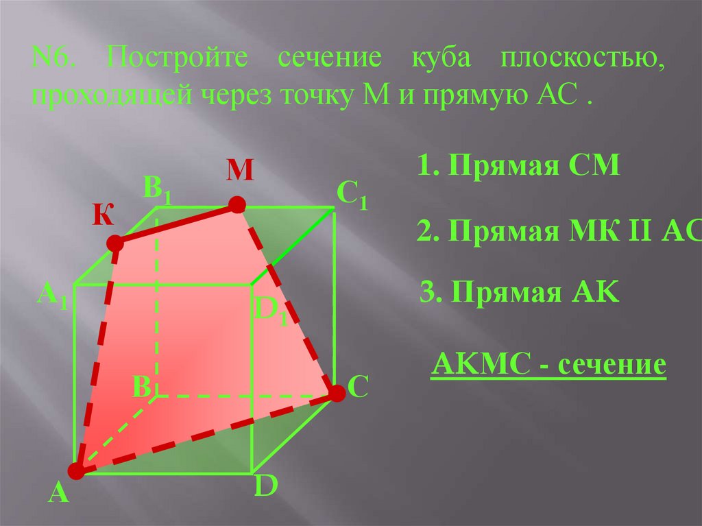 N6. Постройте сечение куба плоскостью,проходящей через точку М и прямую АС .