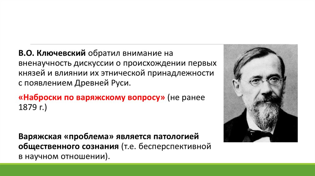 В.О. Ключевский обратил внимание навненаучность дискуссии о происхождении первых
