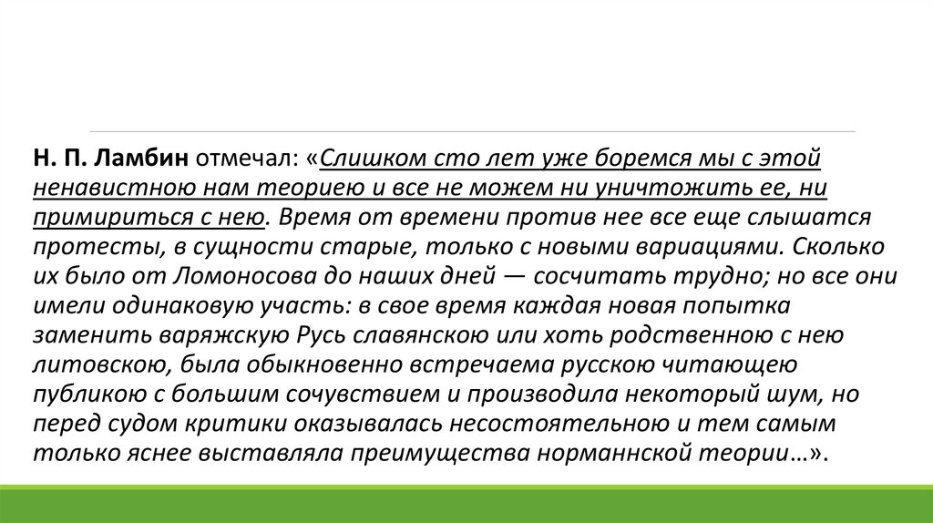 Н. П. Ламбин отмечал: «Слишком сто лет уже боремся мы с этойненавистною нам теориею и все не можем ни уничтожить ее, ни
