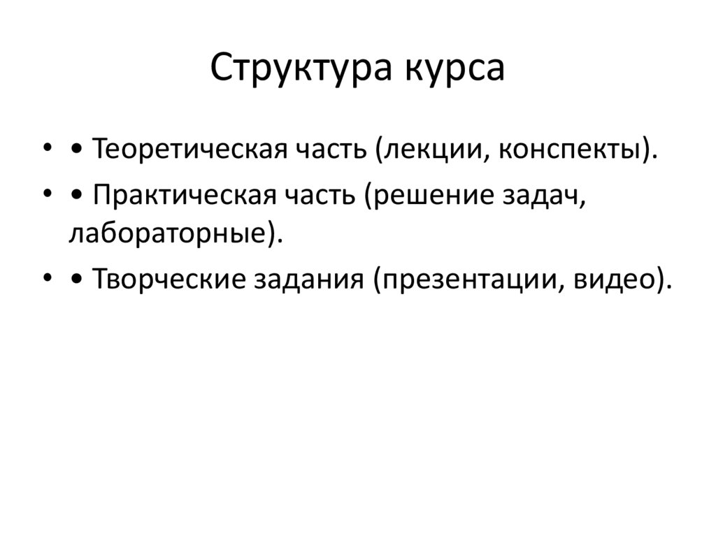Структура курса• • Теоретическая часть (лекции, конспекты).