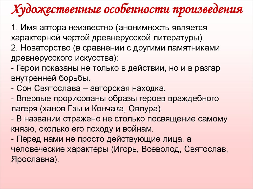 Художественные особенности произведения1. Имя автора неизвестно (анонимность является