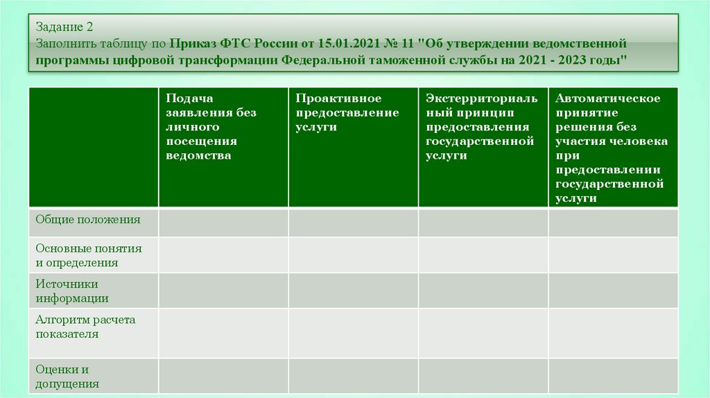 Задание 2Заполнить таблицу по Приказ ФТС России от 15.01.2021 № 11 "Об утверждении ведомственной