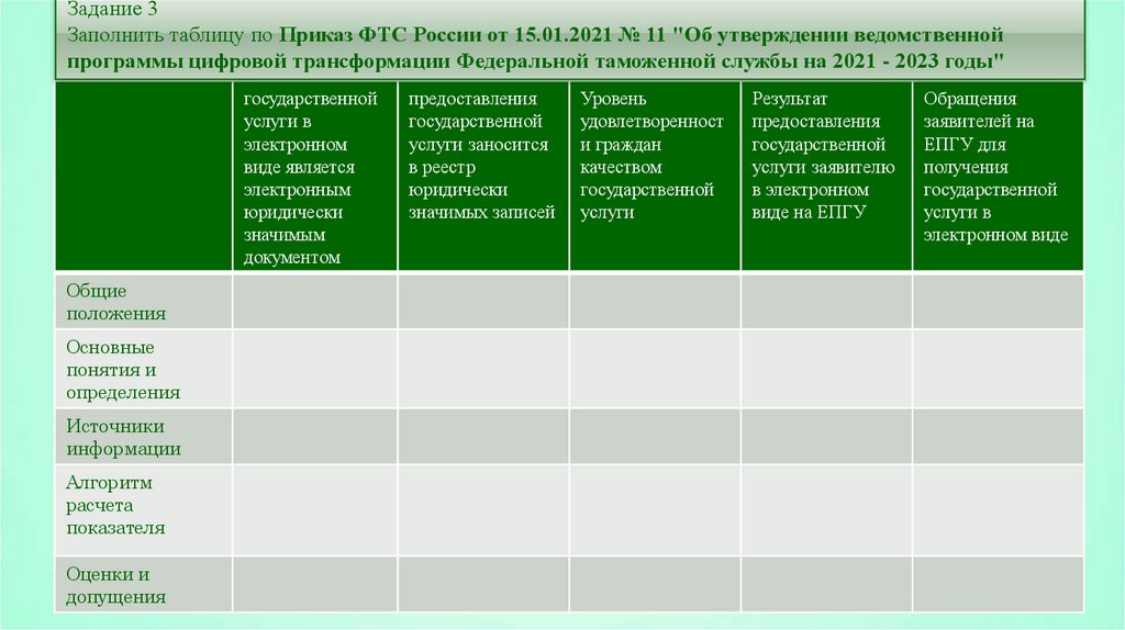 Задание 3Заполнить таблицу по Приказ ФТС России от 15.01.2021 № 11 "Об утверждении ведомственной