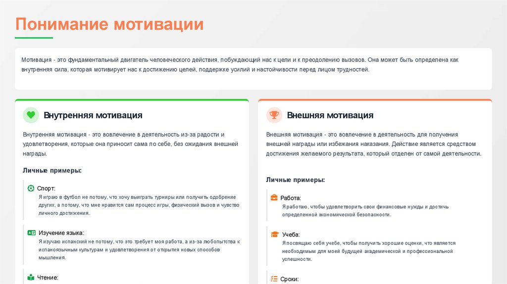 Понимание мотивацииМотивация - это фундаментальный двигатель человеческого действия, побуждающий нас к цели и к преодолению вызовов. Она может быть определена как
