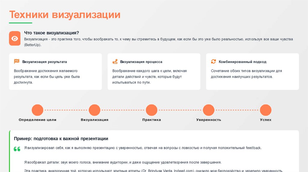Я визуализировал себя, как я выполняю презентацию с уверенностью, отвечая на вопросы с ловкостью и получая положительный feedback.