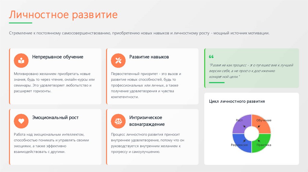 Личностное разв итиеСтремление к постоянному самосовершенствованию, приобретению новых навыков и личностному росту - мощный источник мотивации.