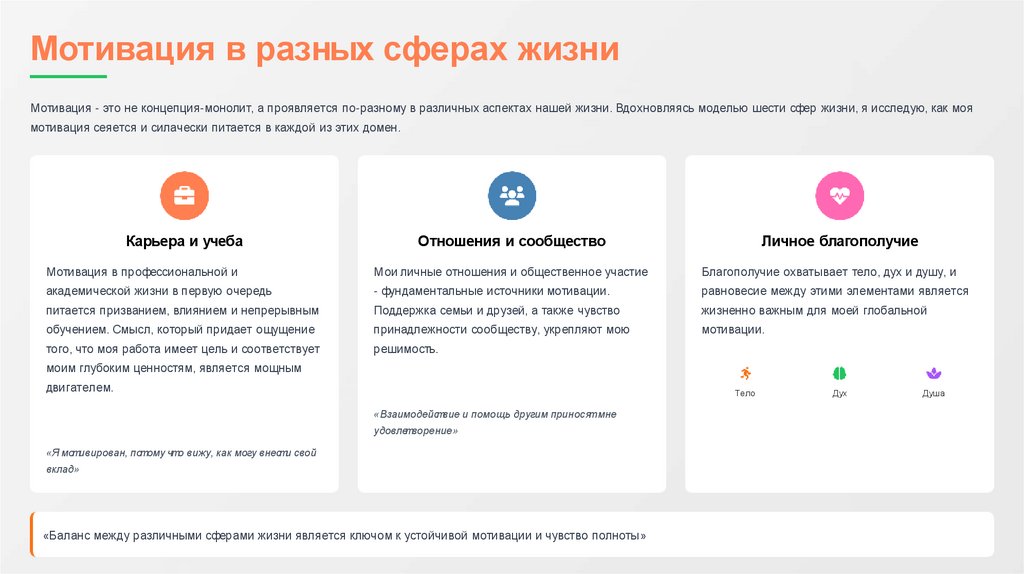 Мотивация в разных сферах жизниМотивация - это не концепция-монолит, а проявляется по-разному в различных аспектах нашей жизни. Вдохновляясь моделью шести сфер жизни, я исследую, как моя