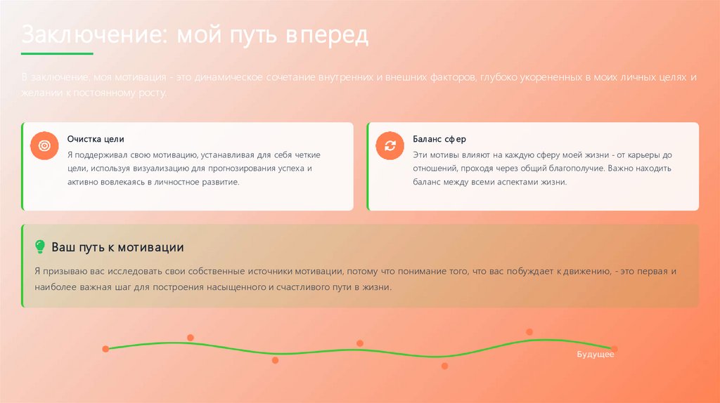 Закл ючение: мой путь в передВ заключение, моя мотивация - это динамическое сочетание внутренних и внешних факторов, глубоко укорененных в моих личных целях и