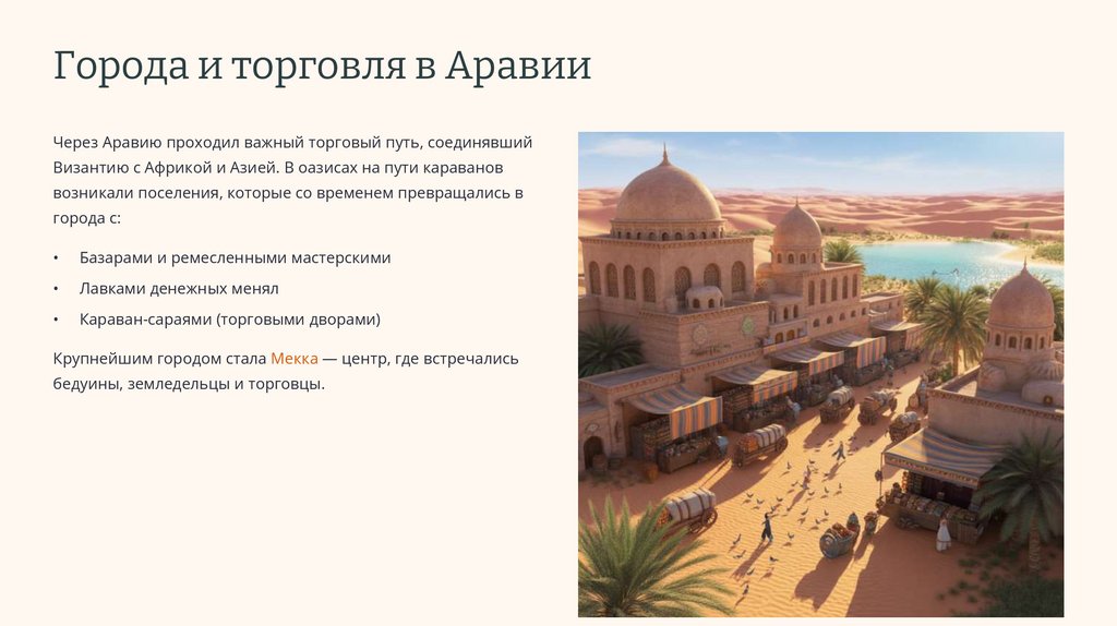 Города и торговля в АравииЧерез Аравию проходил важный торговый путь, соединявший