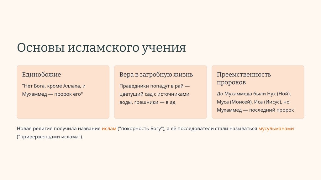 Новая религия получила название ислам ("покорность Богу"), а её последователи стали называться мусульманами