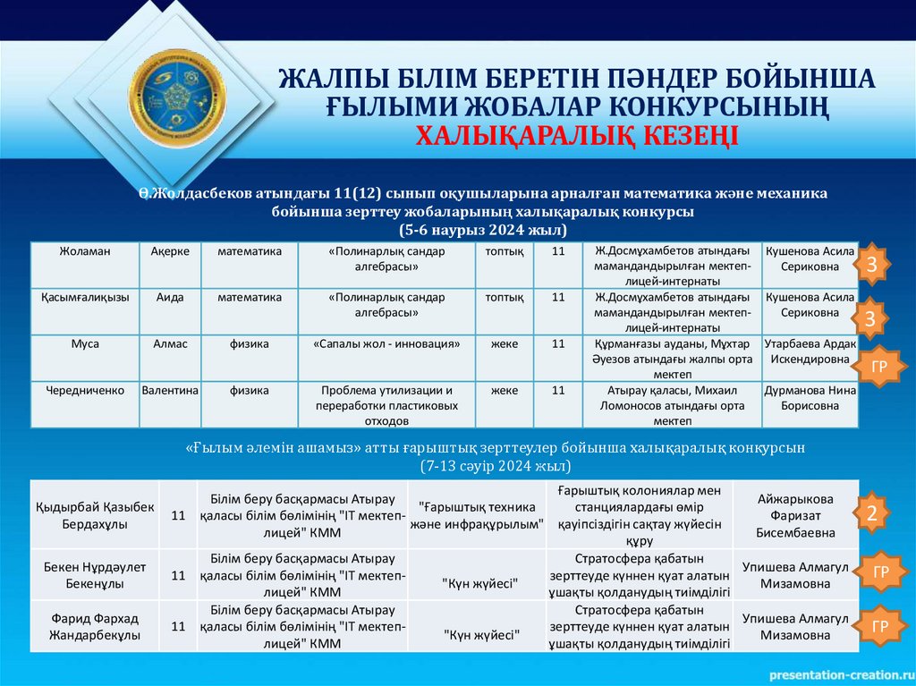 зерттеу жобаларының халықаралық конкурсына қатысатын оқушылар тізімі