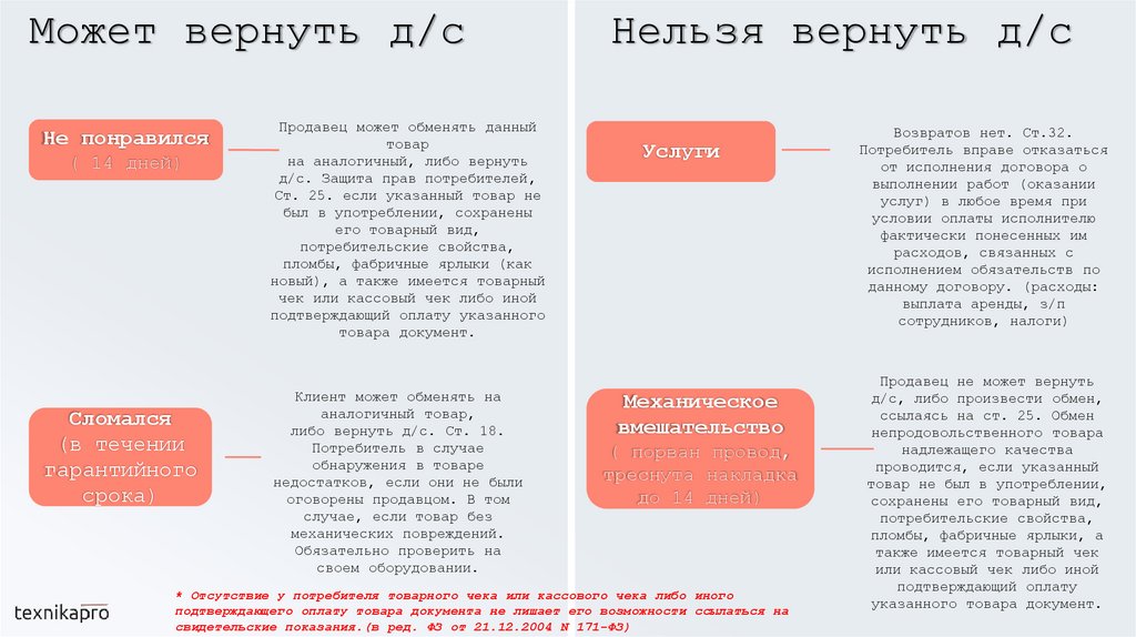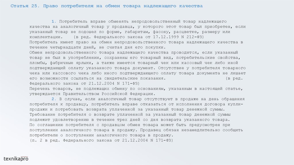 Статья 25. Право потребителя на обмен товара надлежащего качества1. Потребитель вправе обменять непродовольственный товар надлежащего