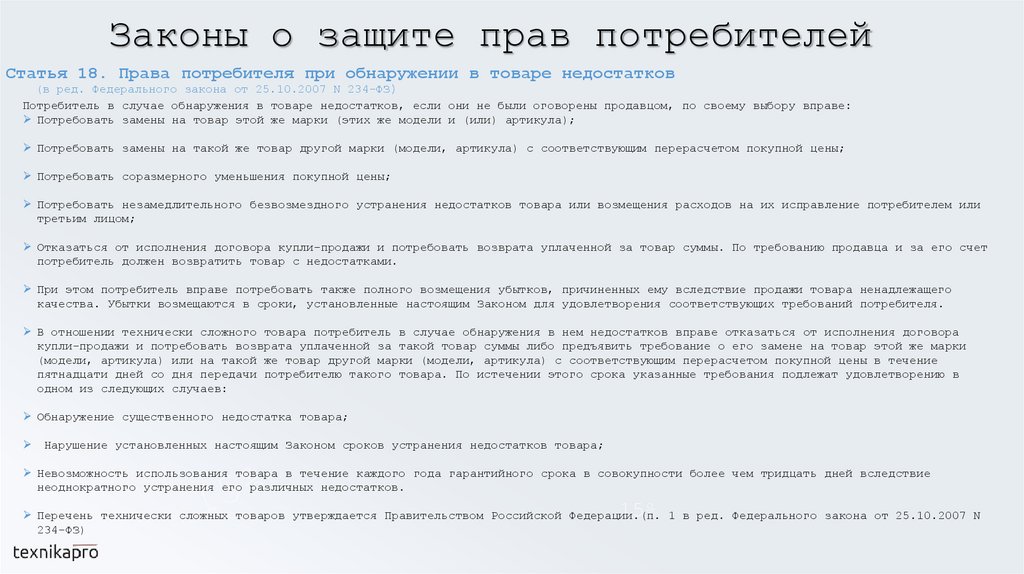 Законы о защите прав потребителейСтатья 18. Права потребителя при обнаружении в товаре недостатков
