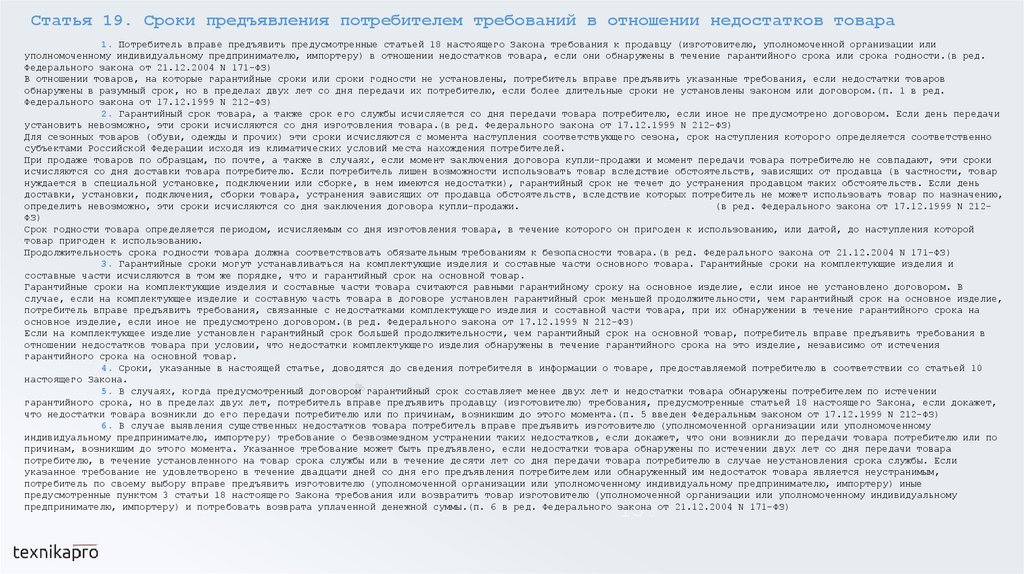 Статья 19. Сроки предъявления потребителем требований в отношении недостатков товара1. Потребитель вправе предъявить предусмотренные статьей 18 настоящего Закона требования к продавцу (изготовителю, уполномоченной организации или