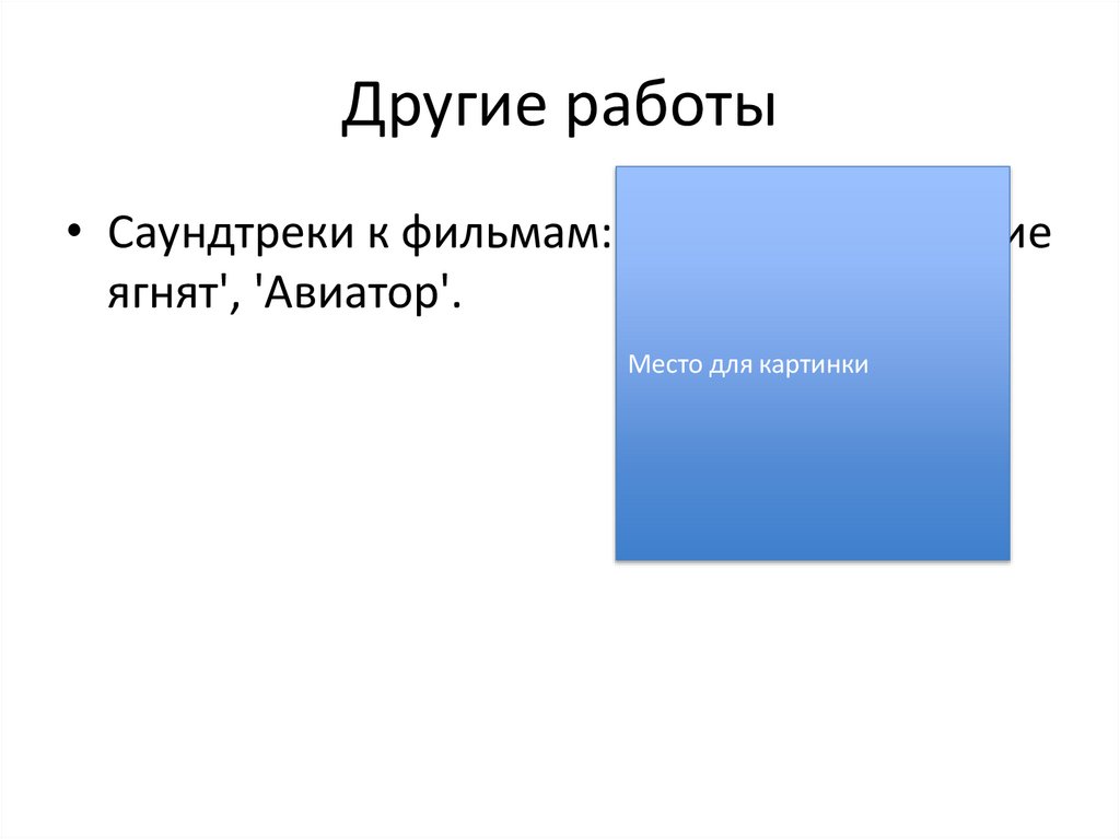 Другие работы• Саундтреки к фильмам: 'Хоббит', 'Молчание