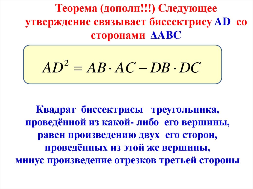 Теорема (дополн!!!) Следующееутверждение связывает биссектрису AD со