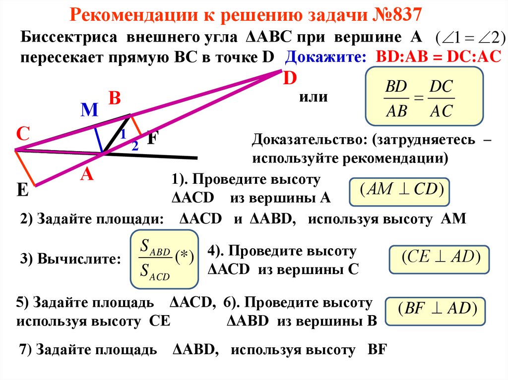 Рекомендации к решению задачи №837Биссектриса внешнего угла ΔАВС при вершине А ( 1 2 )