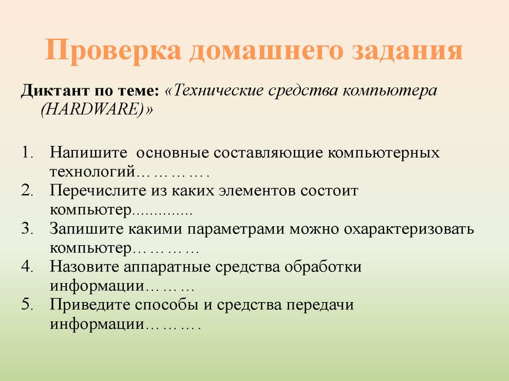 Проверка домашнего заданияДиктант по теме: «Технические средства компьютера