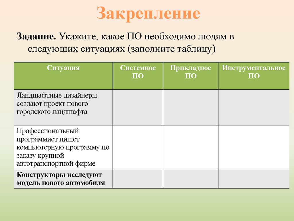 ЗакреплениеЗадание. Укажите, какое ПО необходимо людям в