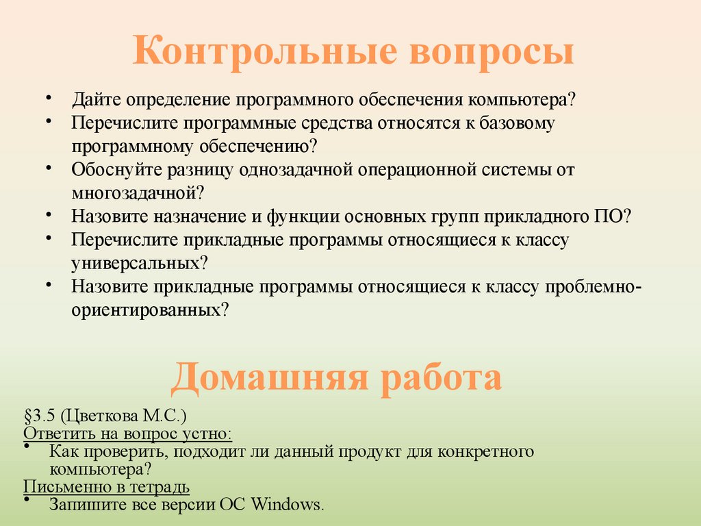 Контрольные вопросы• Дайте определение программного обеспечения компьютера?