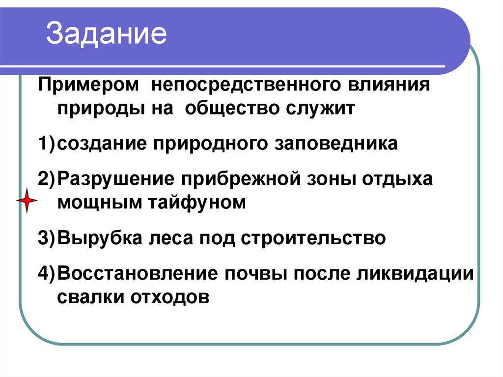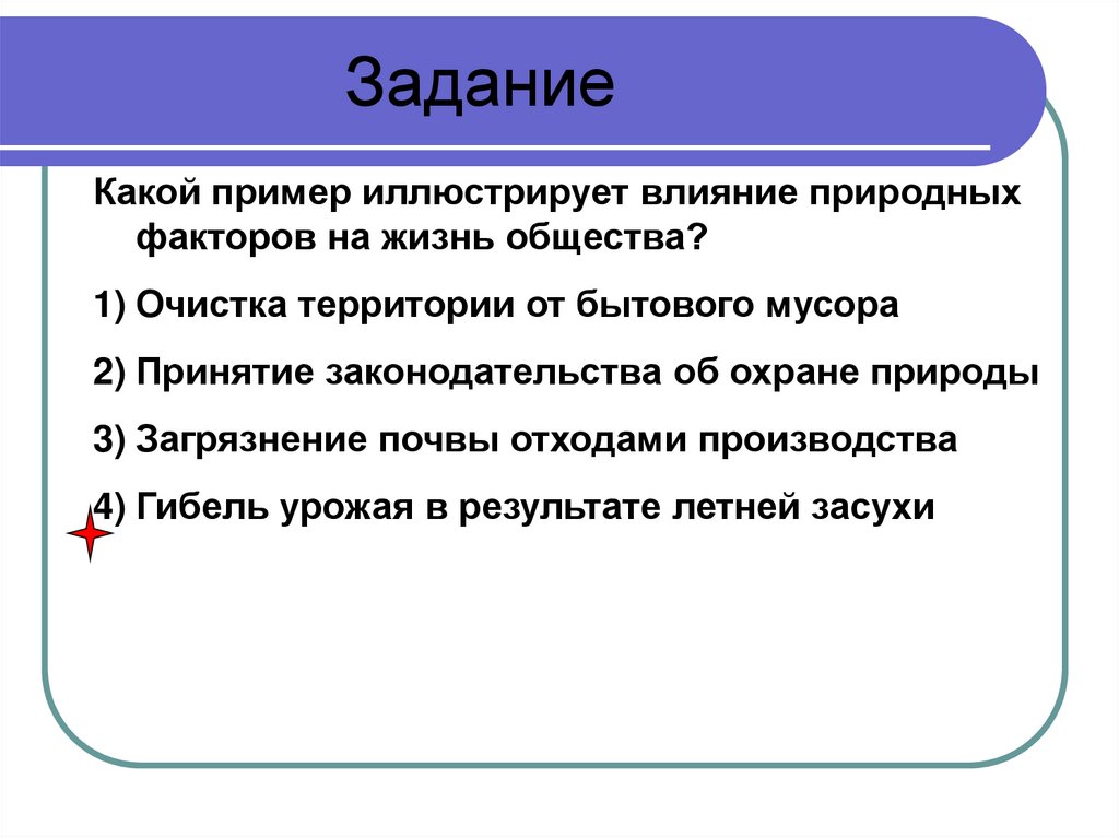 ЗаданиеКакой пример иллюстрирует влияние природных