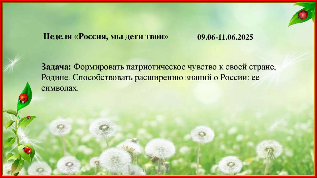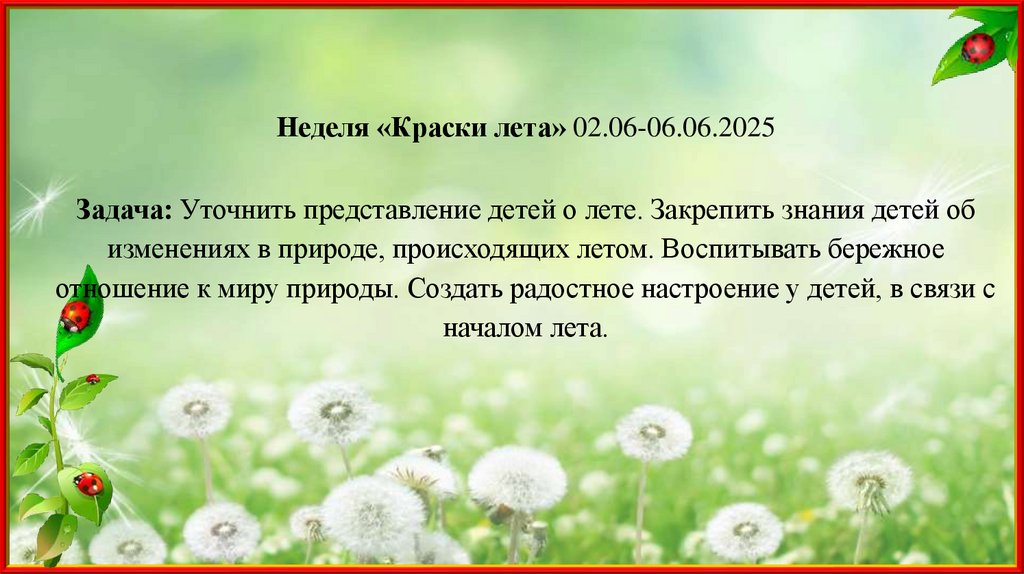 Неделя «Краски лета» 02.06-06.06.2025Задача: Уточнить представление детей о лете. Закрепить знания детей об