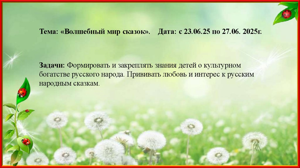 Тема: «Волшебный мир сказок». Дата: с 23.06.25 по 27.06. 2025г.Задачи: Формировать и закреплять знания детей о культурном