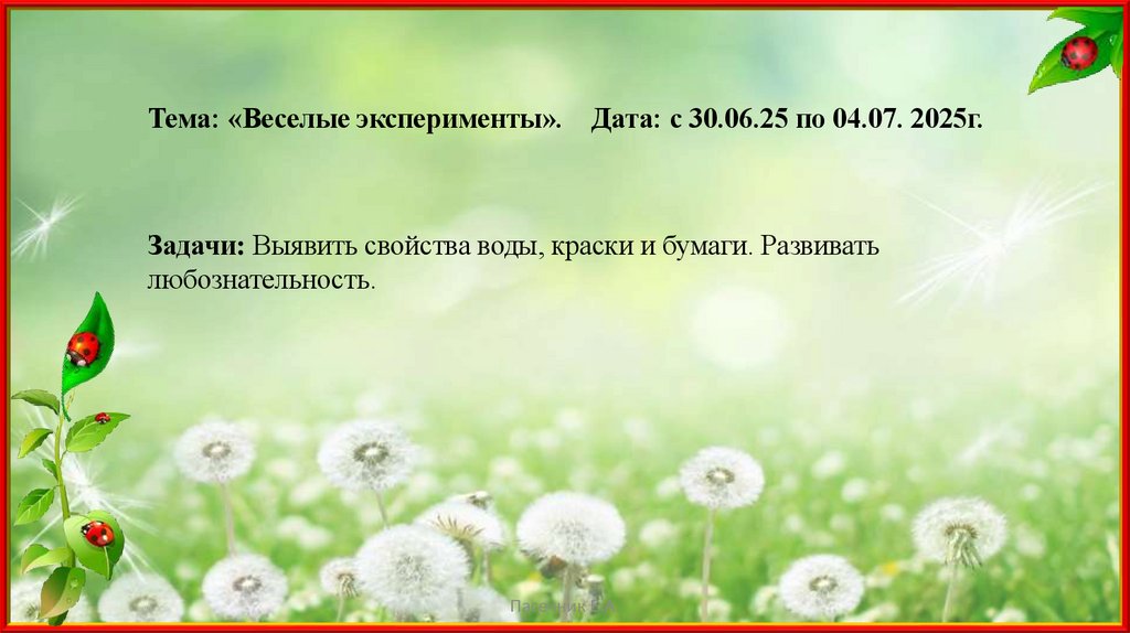 Тема: «Веселые эксперименты».Дата: с 30.06.25 по 04.07. 2025г.