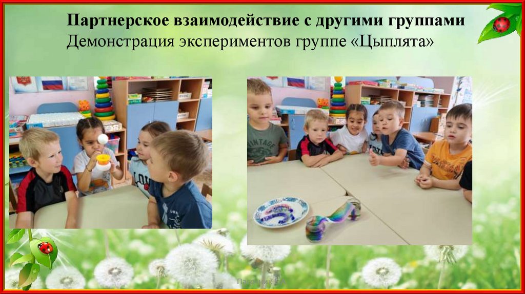 Партнерское взаимодействие с другими группамиДемонстрация экспериментов группе «Цыплята»