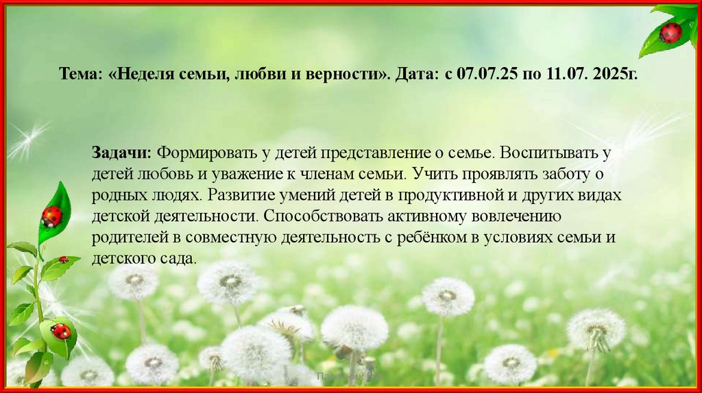 Тема: «Неделя семьи, любви и верности». Дата: с 07.07.25 по 11.07. 2025г.Задачи: Формировать у детей представление о семье. Воспитывать у