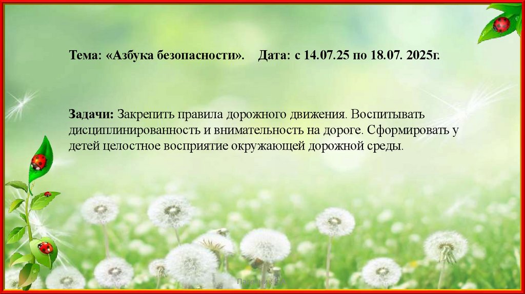 Тема: «Азбука безопасности». Дата: с 14.07.25 по 18.07. 2025г.Задачи: Закрепить правила дорожного движения. Воспитывать