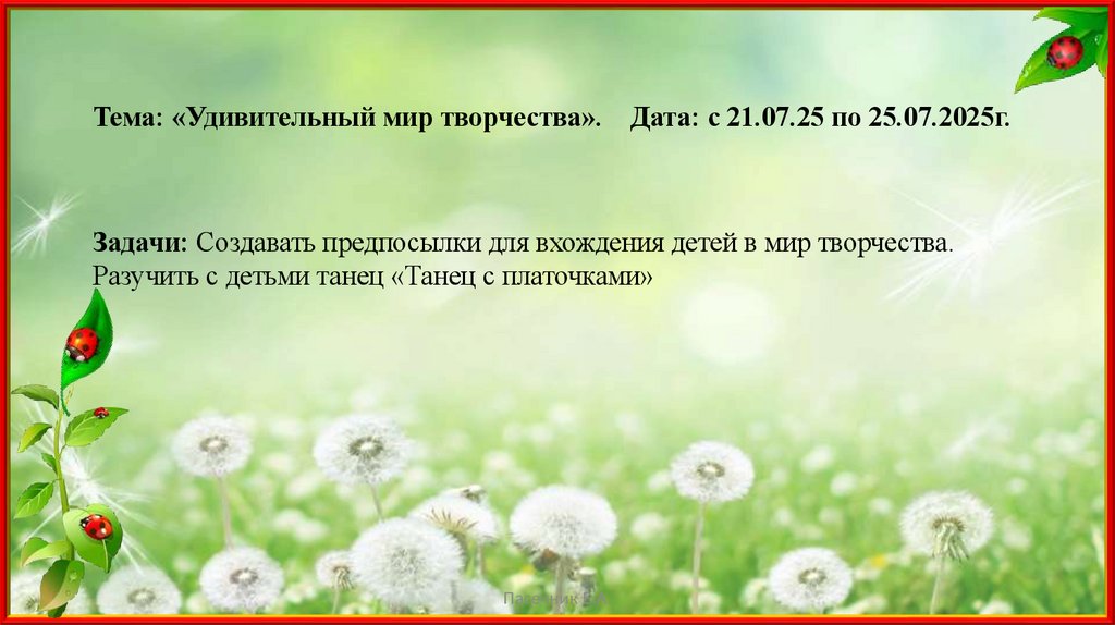 Тема: «Удивительный мир творчества».Дата: с 21.07.25 по 25.07.2025г.