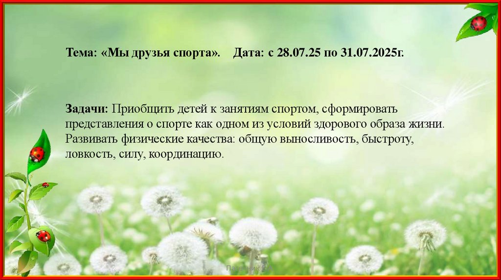 Тема: «Мы друзья спорта».Дата: с 28.07.25 по 31.07.2025г.