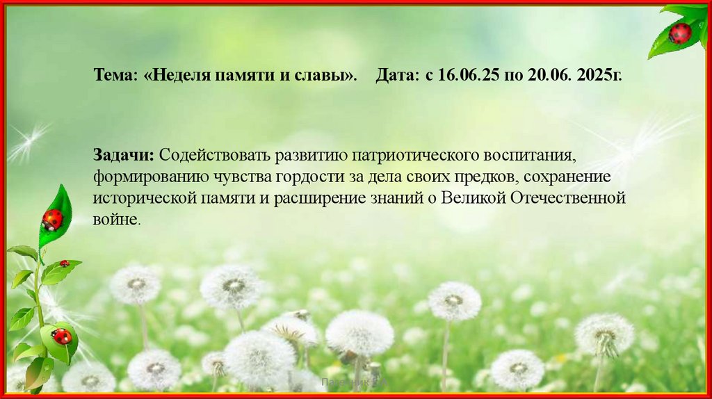 Тема: «Неделя памяти и славы».Дата: с 16.06.25 по 20.06. 2025г.