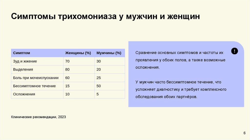 Симптомы трихомониаза у мужчин и женщинСравнение основных симптомов и частоты их