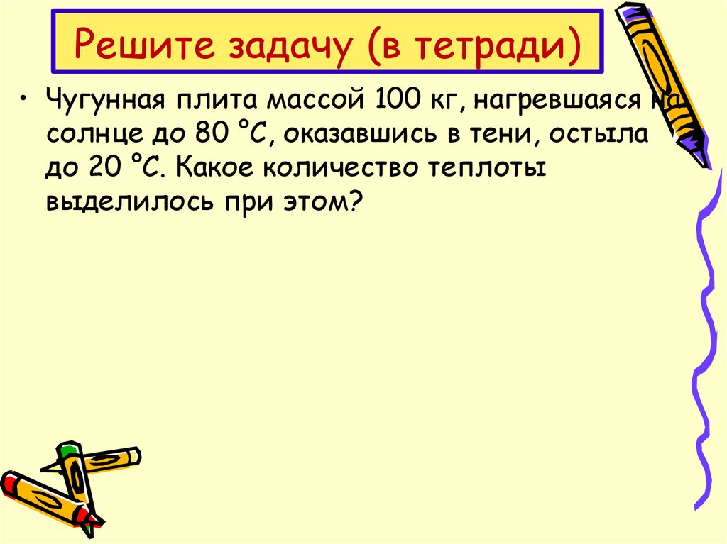 Решите задачу (в тетради)• Чугунная плита массой 100 кг, нагревшаяся на