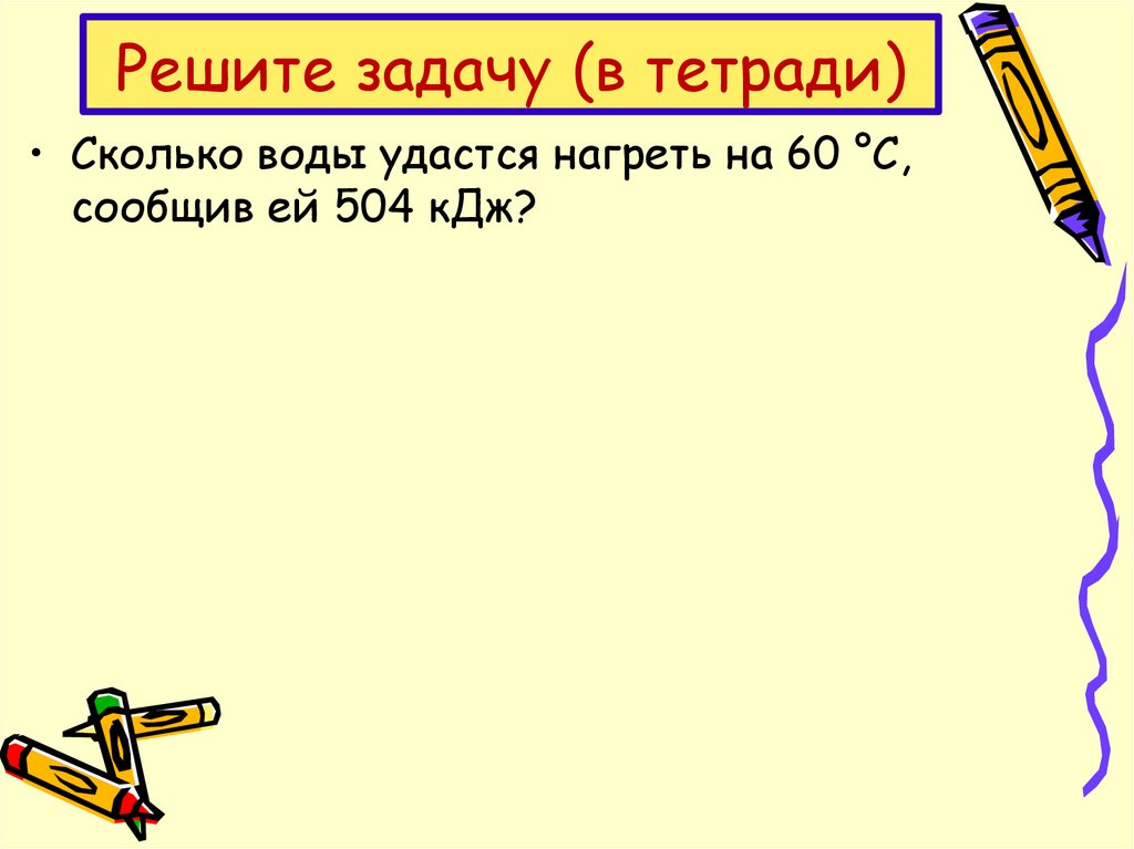 Решите задачу (в тетради)• Сколько воды удастся нагреть на 60 °С,