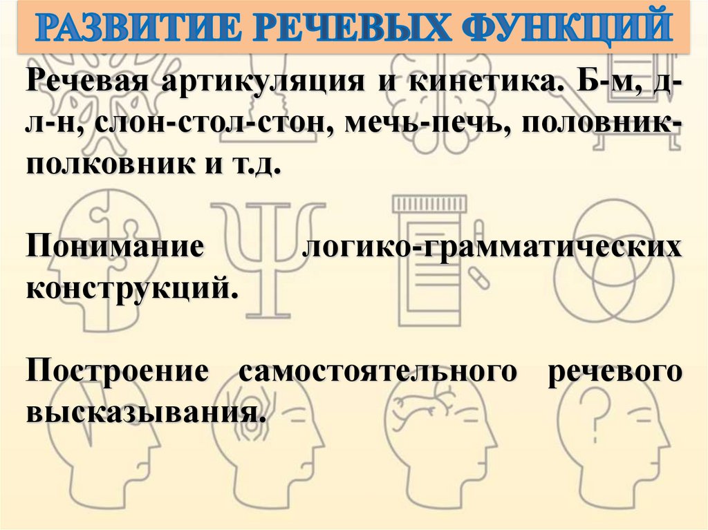Речевая артикуляция и кинетика. Б-м, дл-н, слон-стол-стон, мечь-печь, половникполковник и т.д.Понимание