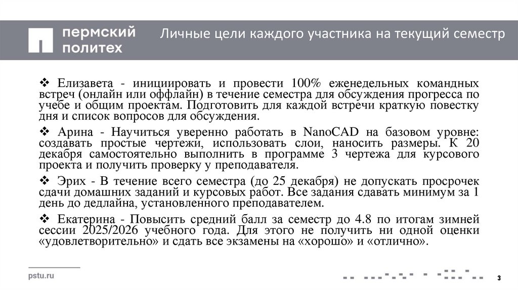 Личные цели каждого участника на текущий семестрЕлизавета - инициировать и провести 100% еженедельных командных