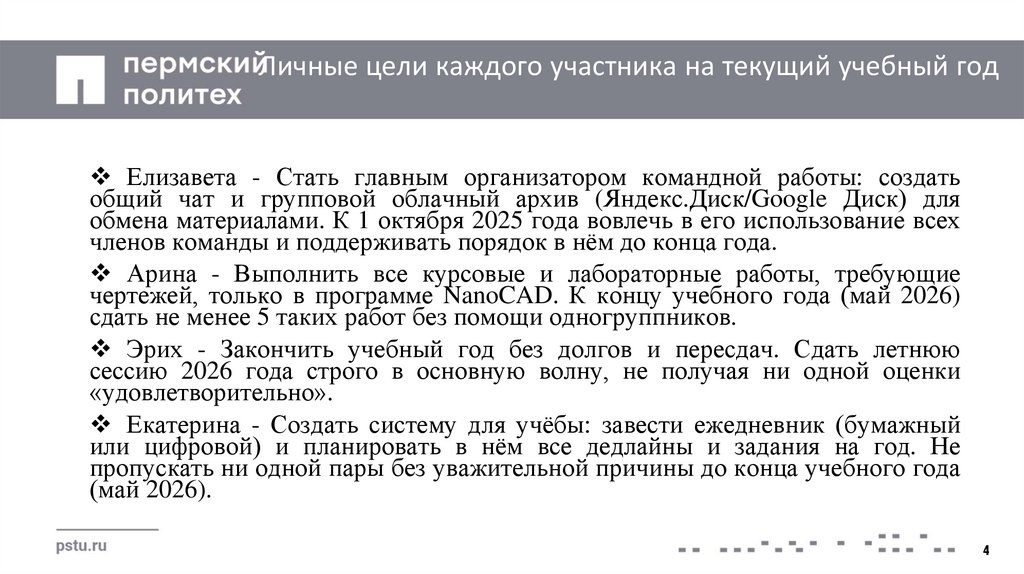 Личные цели каждого участника на текущий учебный годЕлизавета - Стать главным организатором командной работы: создать