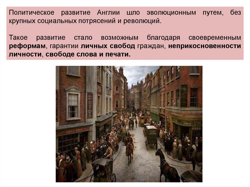 Политическое развитие Англии шло эволюционным путем, безкрупных социальных потрясений и революций.