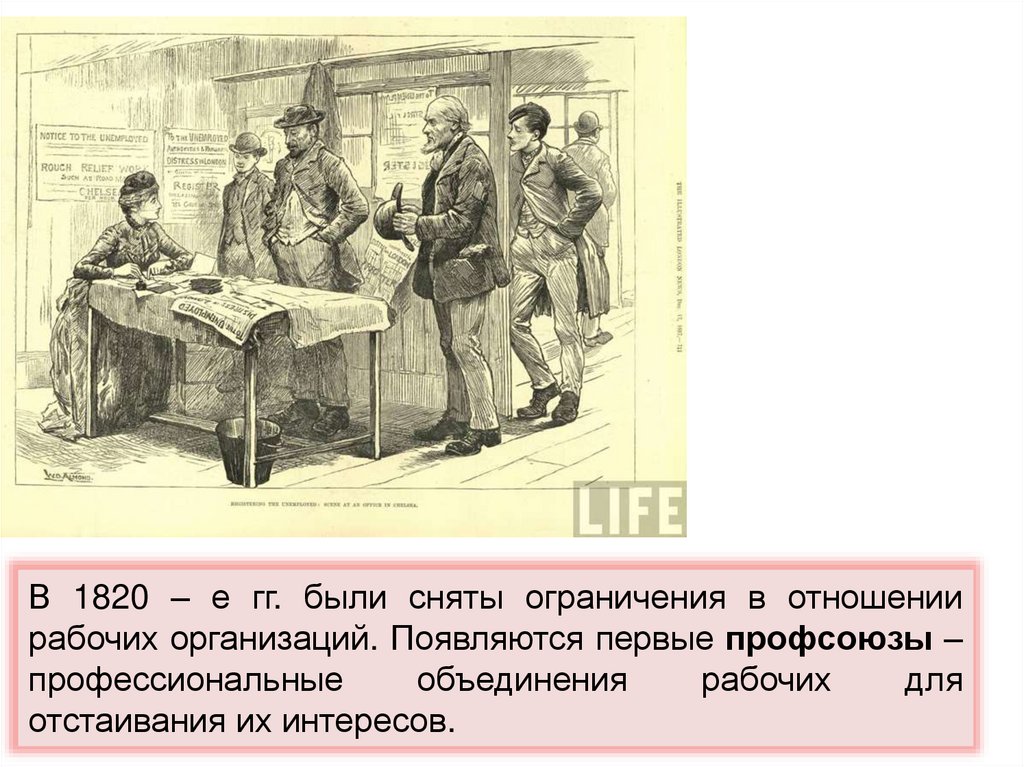 В 1820 – е гг. были сняты ограничения в отношениирабочих организаций. Появляются первые профсоюзы –
