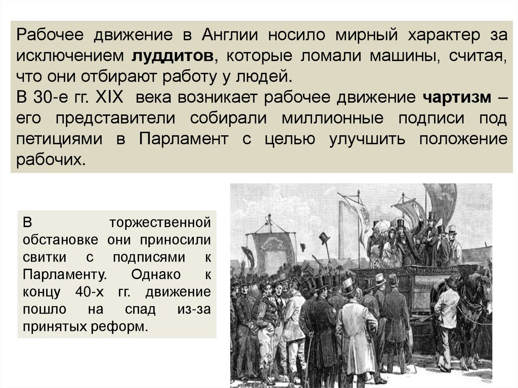 Рабочее движение в Англии носило мирный характер заисключением луддитов, которые ломали машины, считая,