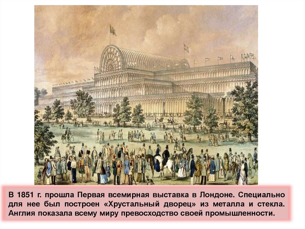 В 1851 г. прошла Первая всемирная выставка в Лондоне. Специальнодля нее был построен «Хрустальный дворец» из металла и стекла.