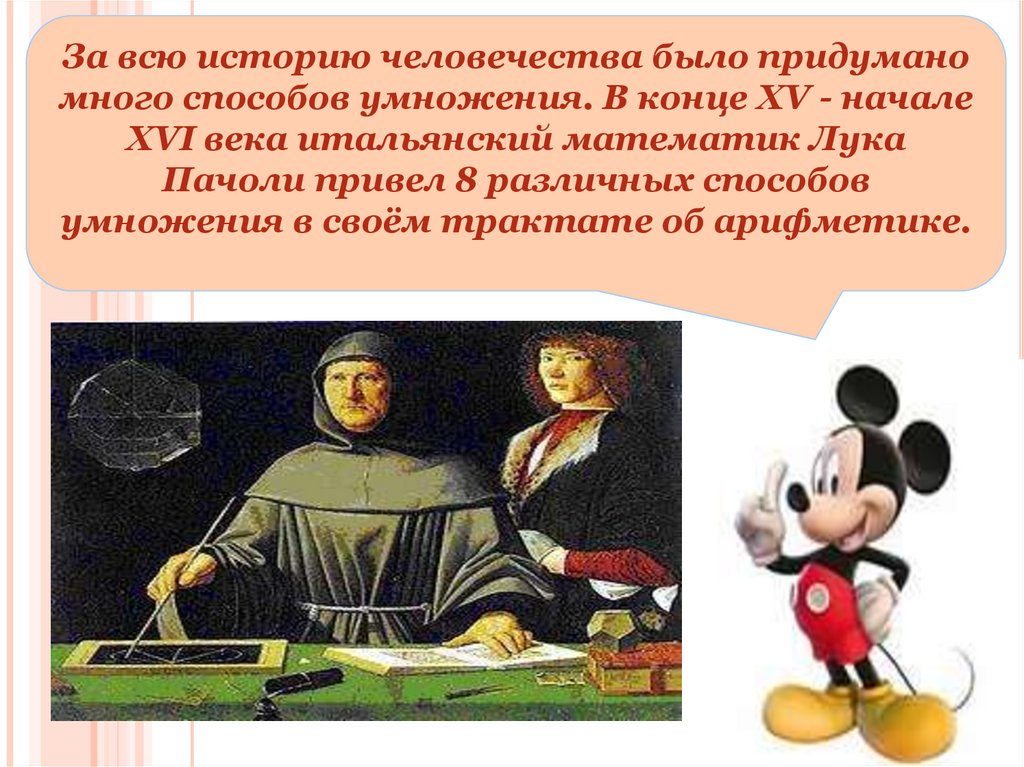 За всю историю человечества было придуманомного способов умножения. В конце XV - начале