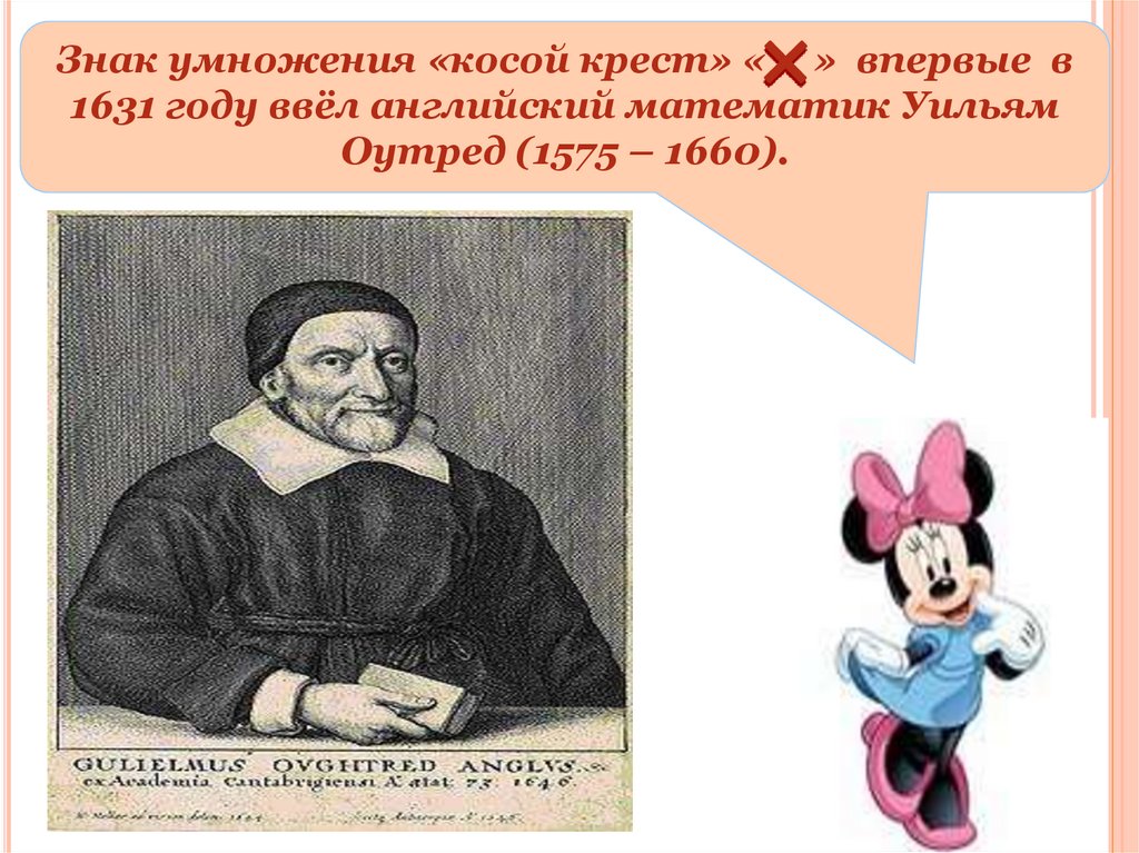 Знак умножения «косой крест» « » впервые в1631 году ввёл английский математик Уильям