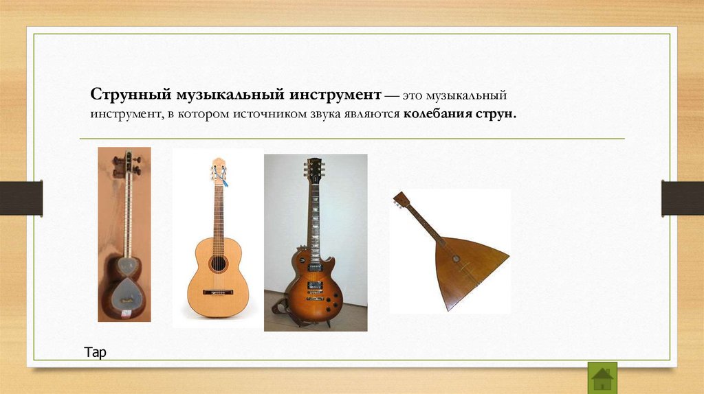 Струнный музыкальный инструмент — это музыкальныйинструмент, в котором источником звука являются колебания струн.