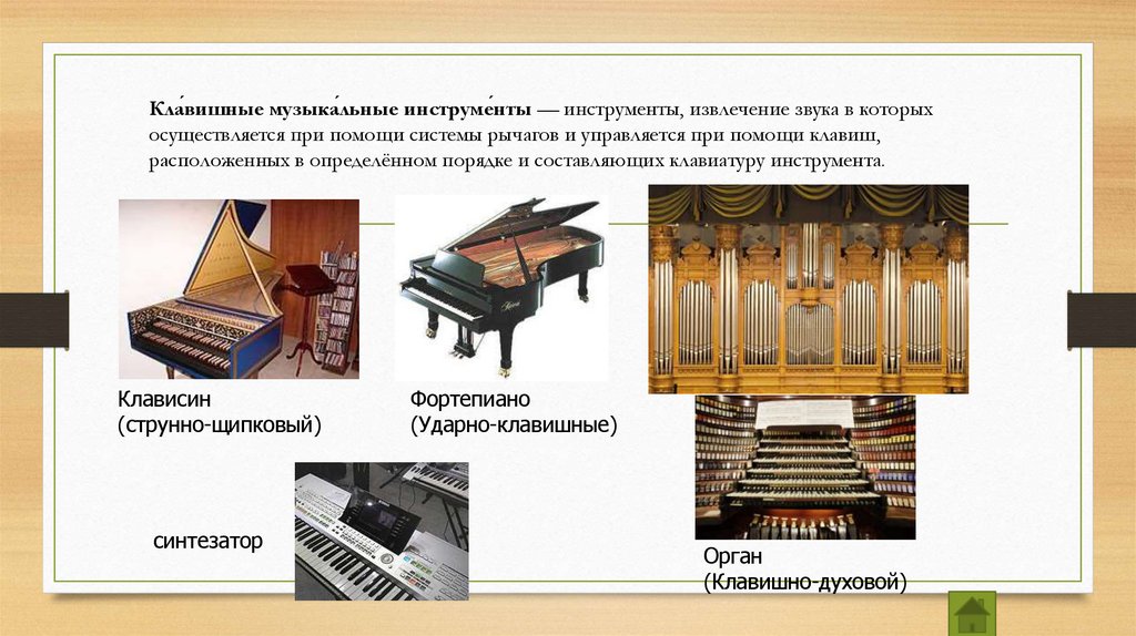 Кла́вишные музыка́льные инструме́нты — инструменты, извлечение звука в которыхосуществляется при помощи системы рычагов и управляется при помощи клавиш,