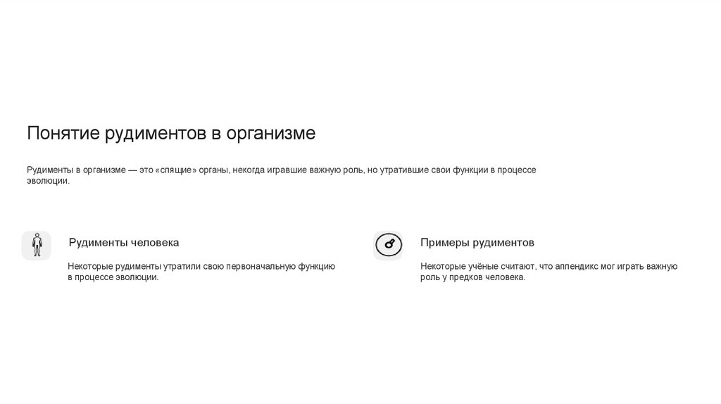 Понятие рудиментов в организмеРудименты в организме — это «спящие» органы, некогда игравшие важную роль, но утратившие свои функции в процессе