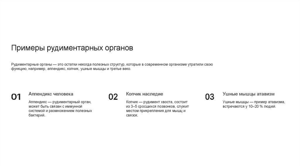 Примеры рудиментарных органовРудиментарные органы — это остатки некогда полезных структур, которые в современном организме утратили свою